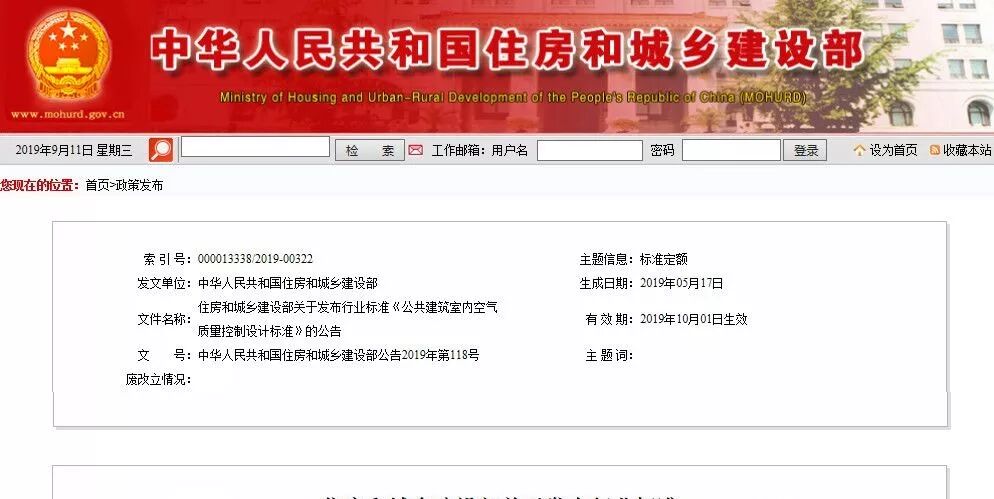现批准《公共建筑室内空气质量控制设计标准》为行业标准,编号为JGJ/T461-2019,自2019年10月1日起实施。