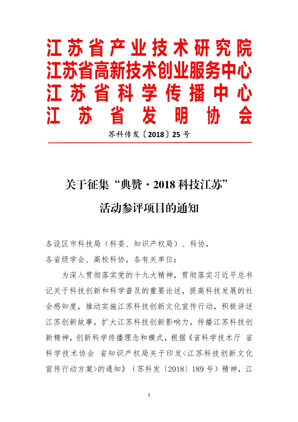 关于征集“典赞·2018科技江苏” 活动参评项目的通知